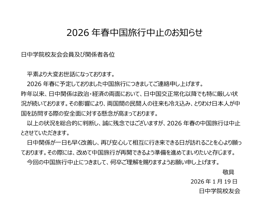 2026年春中国旅行中止のお知らせ